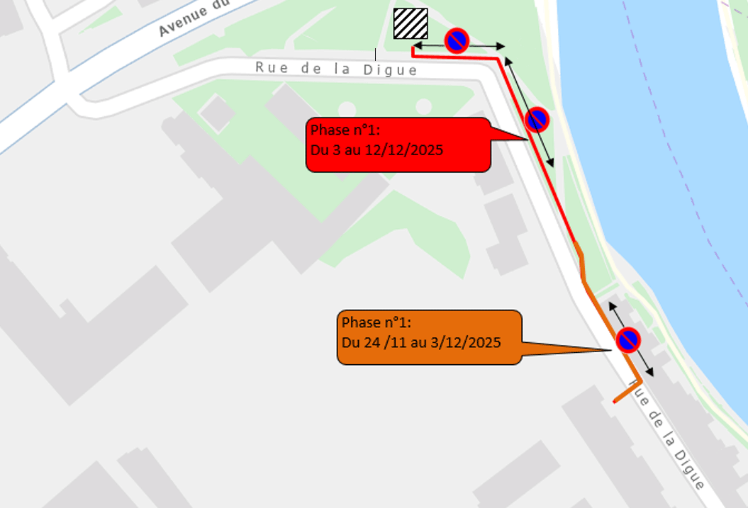 - Phase n°1 : stationnement interdit et circulation alternée rue de la Digue entre le n°21 et le n°27.