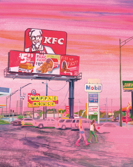 En voiture, il faut une dizaine d’heures pour aller de Detroit à Roma. Ou alors dix jours à pied, du coup, c’est un peu plus long. Ou encore 350 pages, comme dans Detroit Roma, le nouveau roman graphique d’Elene Usdin et Joseph Boni Siran. Roma en Géorgie, on s’entend, enfin Géorgie l’état de la côte Est des Etats-Unis, pas le pays du Caucase. Faites confiance à Elene Usdin, elle s’y connait en road trips. Photographe, illustratrice, auteure de bande dessinée, elle invente des images aux couleurs vibrantes qui ne laissent pas indifférent. Après René.e aux bois dormants, un premier roman graphique en forme de conte onirique bouleversant, elle revient avec un livre signé à quatre mains donc, et en forme de voyage, Detroit Roma. Cette exposition se conçoit comme une invitation à prendre pied dans l’univers d’Elene Usdin qui est fait de déplacements et de glissements de continents en narrations, de compositions en gammes chromatiques. C’est un univers totalement dépaysant et un peu fou comme des dessins le plus souvent réalisés sans crayonnés, en se jetant dans la couleur pour construire des images.