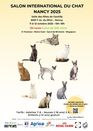 Expo féline Nancy – ANABI × Rotary Jean Prouvé : 30 races différentes et plus de 250 chats. Jugements LOOF, spéciales. À l’honneur : Maine Coon, Sacré de Birmanie, Singapura. Collecte solidaire des billets au profit de la SPA de Lorraine et d’une autre association locale.