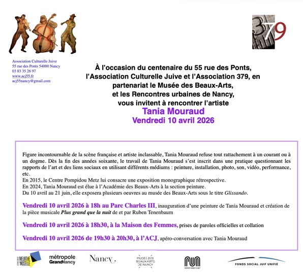 L'ACJ et l'association 379, en partenariat avec le Musée des Beaux-Arts et les Rencontres urbaines de Nancy, vous invitent à rencontrer l'artiste Tania Mouraud.