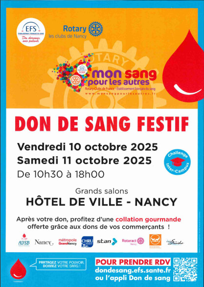 Collecte de sang organisée par l'Etablissement Français du Sang en partenariat avec l'ADSB Nancy et Environs et le Rotary, entre autres.