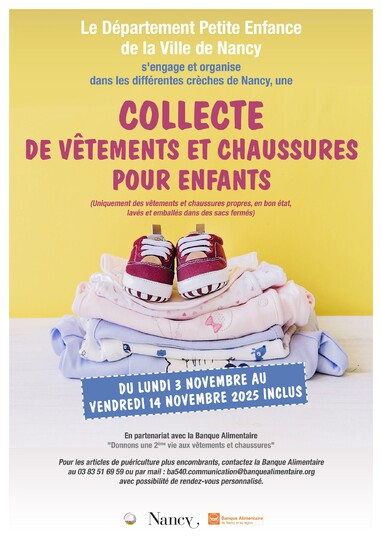 Dans le cadre des actions citoyennes menées par la Direction de la Petite Enfance, une nouvelle collecte de vêtements et chaussures d’enfants est organisée au sein des crèches du Grand Nancy, du lundi 3 au vendredi 14 novembre 2025.