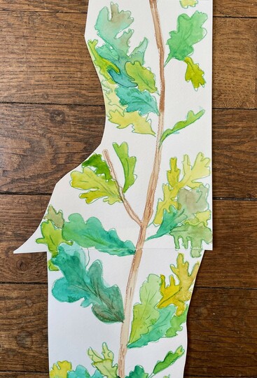 "Composition foisonnante (CP-CE2)" - Sur un support de format irrégulier, élaborer une composition végétale dense associant aquarelle et crayon de couleurs.